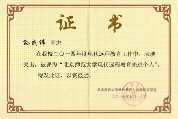 本网讯(通讯员:孙成伟)5月21日至23日,在北京师范大学现代远程教育2015年度校外学习中心管理人员培训及工作会议上,我校连续第五年获评“北京师范大学现代远程教育优秀学习中心”称号,科技学院孙成伟老师因工作认真负责、及时高效,被评选为“2014年度校外学习中心先进个人”。